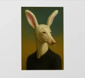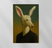 Un ritratto di grande effetto della collezione Elegant Absurdism: un levriero albino che posa tranquillamente di profilo, vestito con orecchie da coniglio sovradimensionate e con uno stuzzicadenti in bocca. Lo stile della pittura a olio e lo sfondo morbido creano un'atmosfera raffinata e museale, mentre i dettagli assurdi conferiscono arguzia e fascino.