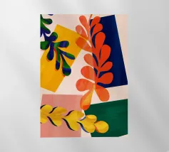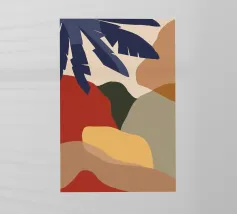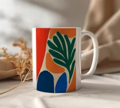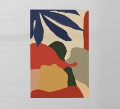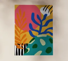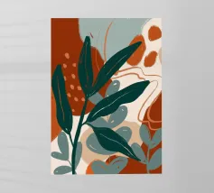 Un'audace composizione astratta presenta forme organiche in vibranti tonalità di arancio, blu e verde. Una grande forma verde simile a una foglia contrasta con il caldo sfondo arancione e rosso.