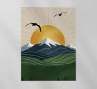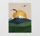 Un'illustrazione splendidamente stratificata e minimalista che presenta una maestosa catena montuosa innevata e i pendii inferiori ondulati, racchiusi in una forma astratta a goccia. Il disegno utilizza colori naturali e tenui e sottolinea i contorni sereni del paesaggio selvaggio.