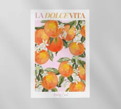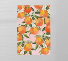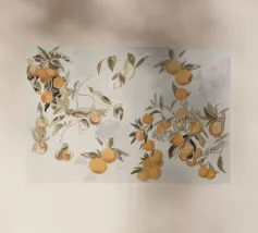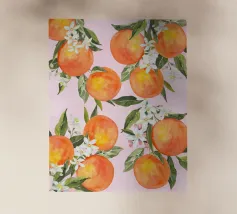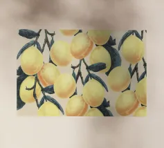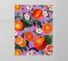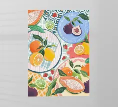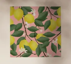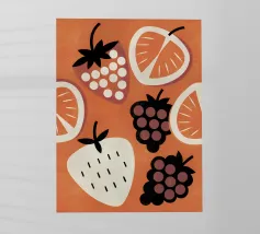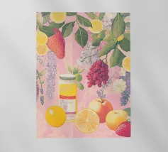 Un collage colorato di frutta fresca e fiori di ciliegio in tenui colori pastello che dà vita all'estate su uno sfondo rosa. Ideale per gli amanti del mercato della frutta e della natura!