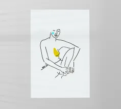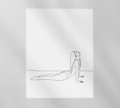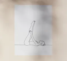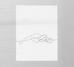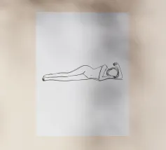 Illustrazione minimalista al tratto di una figura femminile reclinata, che cattura un senso di rilassamento e agio. I cerchi morbidi e dai toni terrosi aggiungono calore ed equilibrio alla composizione. Perfetto per chi ama un arredamento semplice, moderno ed elegante.