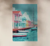 Luminose case color pastello fiancheggiano il dolce porto sotto un cielo turchese, mentre piccole imbarcazioni navigano tranquillamente sull'acqua scintillante. Questa scena cattura il tranquillo fascino caraibico di Antigua e Barbuda: luce, colore e architettura serena in perfetta armonia. Un'opera d'arte che porta una rilassante vibrazione costiera nel vostro spazio, invitando a sognare ad occhi aperti e a ricordare l'isola.