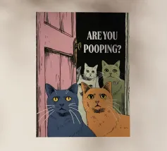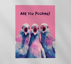 Tre piccioni sono raffigurati in un disegno semplice e umoristico con la frase "ARE YOU POOPING?" sopra di loro. L'immagine utilizza una tavolozza di colori minimalista, caratterizzata principalmente da blu scuro su bianco.