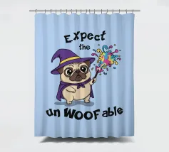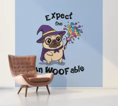 Un simpatico carlino vestito da mago lancia un'esplosione di magia colorata con la frase "Expect the unWOOFable".