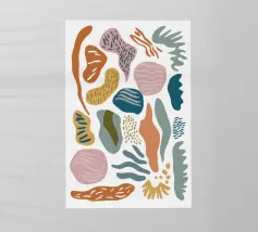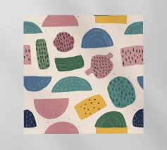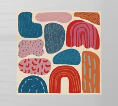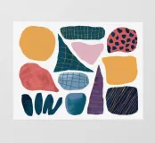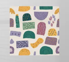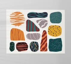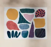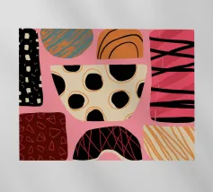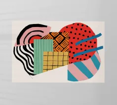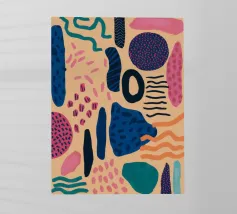 Una composizione astratta di forme assemblate con varie texture e motivi, tra cui griglie e punti. La sofisticata palette di colori e la disposizione equilibrata le conferiscono un'atmosfera da metà secolo moderno.