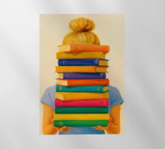Ritratto di una persona con un taglio di capelli nero a caschetto, completamente assorta nel libro verde che sta leggendo. Lo stile senza volto focalizza l'attenzione dello spettatore sull'atto della lettura e sulla tranquilla contemplazione.