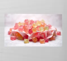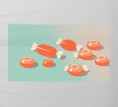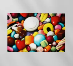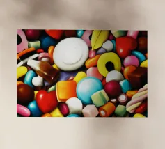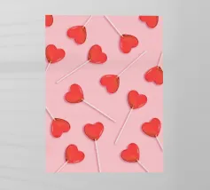 Un vivace mix di caramelle è distribuito su una superficie rosa, che mostra varie forme e colori, tra cui lecca-lecca roteanti e dolciumi rotondi. Questa disposizione giocosa invita a una gioiosa indulgenza.