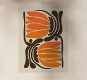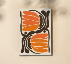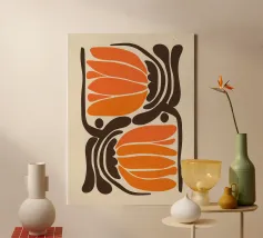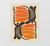 Un affascinante studio grafico di simmetria ornamentale che combina le forme fluide e organiche dell'Art Nouveau con l'estetica chiara e audace dell'Art Déco. La composizione è quasi simmetrica e celebra il rispecchiamento di forme e linee. La tavolozza dei colori è volutamente ridotta: Un tono caldo e saturo di arancio/terracotta (che simboleggia la frutta e il calore) è accentuato da un marrone intenso (che simboleggia la terra e la struttura). L'immagine emana un'eleganza calma e misteriosa, perfetta per gli amanti del design grafico e minimalista.