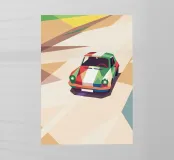 Illustrazione di un'auto da corsa con una combinazione di colori unica sulla strada con uno stile geometrico moderno.