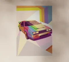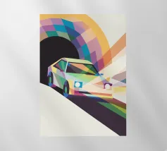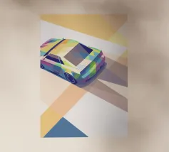 Illustrazione di un'auto da corsa con una combinazione di colori unica sulla strada con uno stile geometrico moderno.