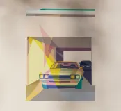 Illustrazione di un'auto in un garage con uno stile geometrico moderno.