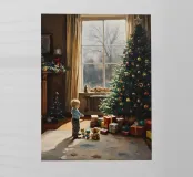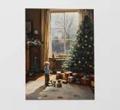 Un delizioso motivo natalizio: un bambino si trova stupito di fronte all'albero di Natale decorato, circondato da regali colorati e luci scintillanti. La delicata luce invernale entra nella stanza attraverso la grande finestra, creando un'atmosfera piena di calore, sicurezza e attesa. Un'immagine senza tempo di gioia infantile e magia natalizia.