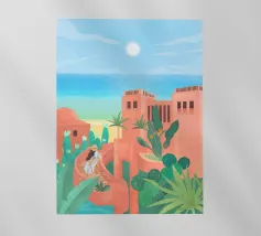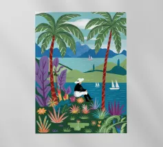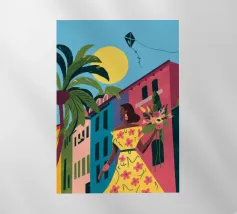 Una scena di spiaggia vivace e stravagante con una mongolfiera colorata che fluttua in un cielo soleggiato. Una persona si rilassa su una coperta sulla sabbia, creando una rappresentazione idilliaca, gioiosa e leggermente surreale di una giornata perfetta.