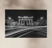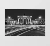 Impressionante scatto notturno della Porta di Brandeburgo a Berlino, brillantemente illuminata contro un cielo blu intenso. Ciò che rende questo motivo così speciale sono le scie luminose dinamiche dei veicoli in transito, che attraversano l'immagine come linee fluide di energia e trasmettono movimento e vita urbana. La perfetta simmetria dell'edificio incontra la moderna lunga esposizione e crea un emozionante contrasto tra architettura storica e design fotografico contemporaneo. Un vero e proprio colpo d'occhio! Una veduta in bianco e nero che enfatizza la forma architettonica con un'eleganza senza tempo.