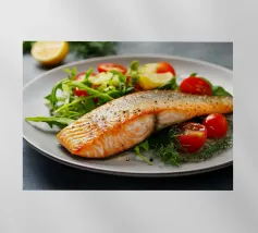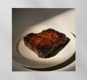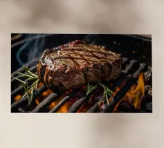 Una bella bistecca alla griglia è adagiata su un piatto bianco, ornato dai segni della griglia. La calda luce del sole mette in risalto i suoi colori ricchi, creando un'atmosfera invitante perfetta per il pranzo.