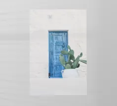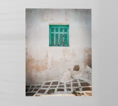 Paros Blue - Arte murale di una persiana greca: Una semplice persiana blu contro un muro imbiancato, catturata sull'isola greca di Paros. Questa fotografia mette in risalto la bellezza del minimalismo mediterraneo: linee pulite, contrasti decisi e un cielo estivo infinito. Una stampa rilassante che porta la sensazione di sole, mare e vita isolana in qualsiasi stanza.
