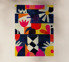 Forme audaci e astratte e colori vivaci formano una collezione di bottiglie e oggetti stilizzati, ognuno con un layout geometrico distinto. Le linee curve e le tonalità contrastanti creano un senso di movimento ed estrosità.
