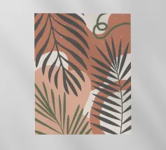 Foglie stilizzate in nero e verde si stagliano su uno sfondo di strisce curve e fluide in morbide tonalità di terra. Il disegno combina elementi botanici con forme geometriche astratte per un look moderno.