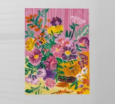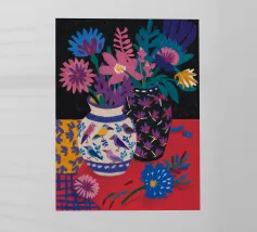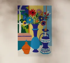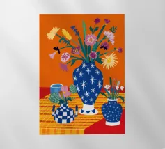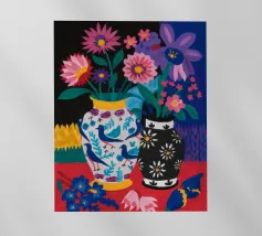 Una vibrante ed eclettica natura morta con un bouquet di fiori in due vasi con motivi diversi, uno a macchie e uno a ghirigori. La tovaglia a motivi aggiunge un mix gioioso e massimalista di colori e design.