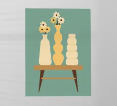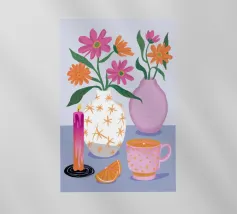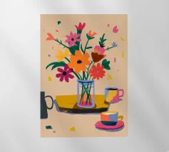 Un'affascinante natura morta di un semplice bouquet di fiori bianchi e arancioni in un vaso, seduto su un tavolo con una tovaglia a scacchi rossi e bianchi. La scena ha un'atmosfera calda, rustica e leggermente nostalgica.