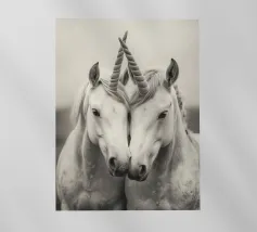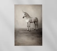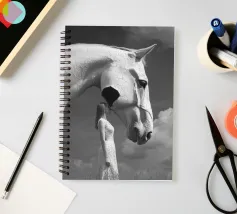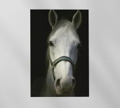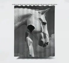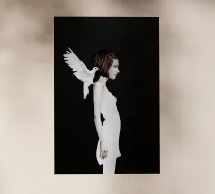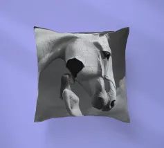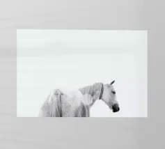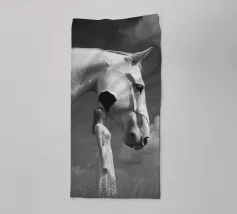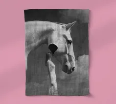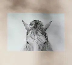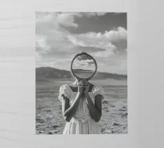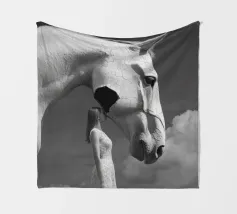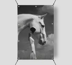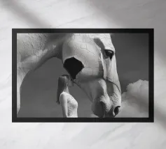 Un'immagine surreale in bianco e nero di una donna in abito di pizzo che si trova di fronte a una gigantesca testa di cavallo con texture screpolate, che crea un'atmosfera onirica e stimolante in un cielo nuvoloso.