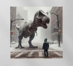 Un'immagine surreale in bianco e nero di una donna in abito di pizzo che si trova di fronte a una gigantesca testa di cavallo con texture screpolate, che crea un'atmosfera onirica e stimolante in un cielo nuvoloso.