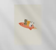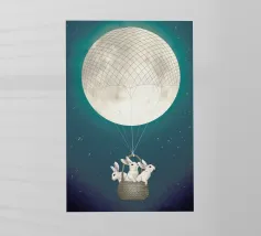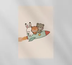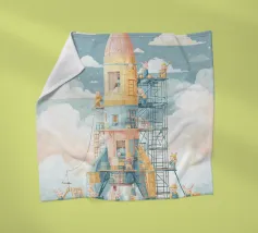 Una deliziosa illustrazione verticale con una squadra di estrosi coniglietti ingegneri che costruiscono un razzo colorato sotto un cielo da sogno. La scena è ricca di affascinanti dettagli costruttivi: scaffali, cianografie, secchi di vernice e lavoro di squadra in movimento. Perfetto per le stanze dei bambini o per le collezioni d'arte fantasiosa, questo pezzo invita gli spettatori a esplorare la gioia di costruire e sognare in grande.
