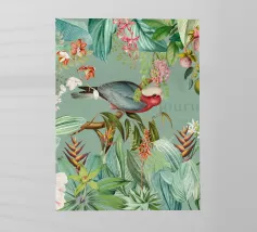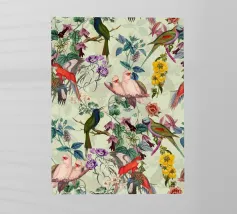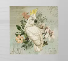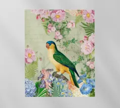 Un lussuoso disegno vintage di Uta Naumann con uno sfondo verde mela che fornisce una base fresca e vibrante per la scena. Al centro, due squisiti cacatua bianco-rosa si appollaiano con grazia, circondati da rigogliose rose Redouté dalle tenui sfumature rosa. La composizione cattura il fascino di antiche illustrazioni botaniche mescolate al fascino tropicale. Questo disegno in stile collage evoca eleganza e bellezza naturale, perfetto per un arredamento sofisticato, per la moda o per la cartoleria. La combinazione di verde vivo e fiori delicati crea un'estetica esotica e senza tempo.