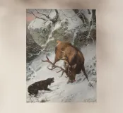 Un impressionante dipinto realistico mostra il drammatico incontro tra un possente cervo e un cane da caccia tra le montagne innevate. La scena cattura la tensione, la selvaticità e il dinamismo della caccia, magistralmente realizzata con luci e dettagli raffinati. Lo sfondo invernale con rocce e rami spogli enfatizza la drammaticità della situazione. Un classico motivo di caccia per gli amanti della pittura animale tradizionale e dell'arte naturalistica realistica.
