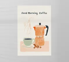 Black and white illustration with moka pot, beans and "Caffè?" lettering. Clean design with a retro touch, perfect for coffee lovers and modern kitchen walls.