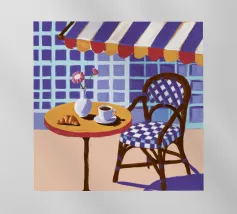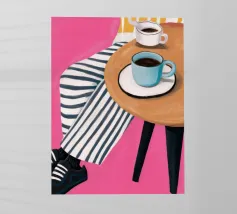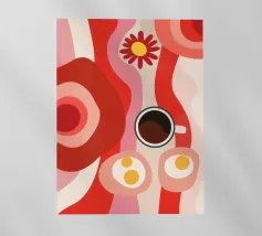 Vista dall'alto di una semplice colazione su una tovaglia a scacchi rossi e bianchi, con una tazza di caffè e un ramo d'albero. La composizione minimalista ha un'atmosfera serena, grafica e classica da caffè.