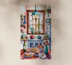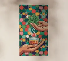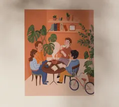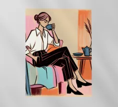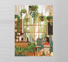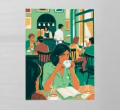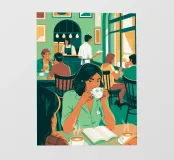 Questo dipinto raffigura una scena di caffè con persone sedute ai tavoli che leggono e conversano. Lo sfondo comprende un cameriere e una parete verde, creando un'atmosfera accogliente e intellettuale.