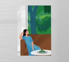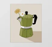 La classica caffettiera Moka è elegantemente presentata come un vaso che contiene una singola e delicata margherita bianca, unendo i rituali del caffè e la bellezza della natura in una natura morta minimalista.