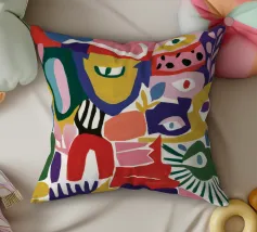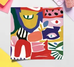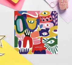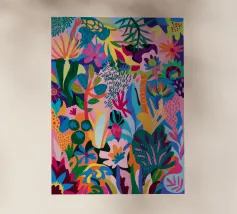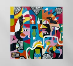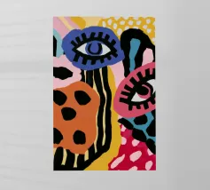 Colori audaci e contrastanti e forme astratte interconnesse caratterizzano quest'opera d'arte di grande impatto visivo. Occhi e forme organiche sono sottilmente inseriti all'interno del vibrante arazzo, suggerendo una narrazione giocosa e misteriosa attraverso il suo design geometrico ma fluido.