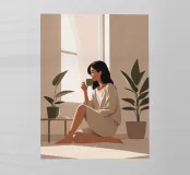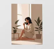 Illustrazione minimalista di una donna seduta pacificamente sul pavimento, che sorseggia un caffè accanto a una finestra illuminata dal sole. La luce calda filtra dolcemente attraverso il vetro, creando un'atmosfera serena e accogliente. Circondata da piante in vaso, il suo semplice abbigliamento beige si fonde magnificamente con i toni tenui della stanza, evocando un senso di calma, consapevolezza e tranquillo comfort: il momento di quiete perfetto per iniziare la giornata.