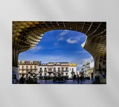 L'immagine mostra un interno storico della Casa de Pilatos di Siviglia, un palazzo del XVI secolo con influenze architettoniche mudéjar, gotiche e rinascimentali. Le pareti sono completamente ricoperte da piastrelle decorate con motivi geometrici e floreali nei toni del blu, del verde e del marrone. Queste piastrelle sono tipiche dell'arte mudéjar e riflettono la diversità culturale dell'Andalusia. Il soffitto è costituito da pannelli in legno dorato con complessi ornamenti e rilievi che documentano la maestria dell'epoca.