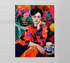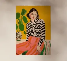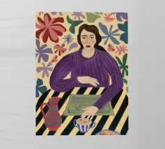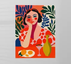 Ritratto di una persona con una camicia a righe bianche e rosse, che appoggia il mento sulla mano dietro un tavolo pieno di agrumi. Lo sfondo è costituito da un rigoglioso disegno di foglie verdi, che crea uno stato d'animo calmo e introspettivo.