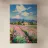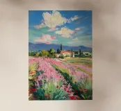 Dipinto a olio di un campo di fiori rosa in Provenza, Francia, con un piccolo villaggio e un cielo blu con nuvole. Lo stile espressionista, le pennellate audaci e visibili, i colori vivaci e la composizione libera creano un paesaggio vivace ed emozionante.