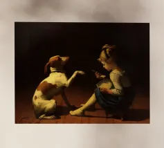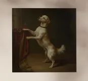 Cane in piedi con le zampe su un tavolo in un ambiente classico pellicola backlit