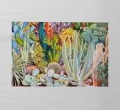 Una vista ravvicinata di un giardino nel deserto rivela una collezione caotica e bellissima di succulente e cactus, dipinti in un tripudio di colori vibranti ed espressivi che celebrano la diversità della flora del deserto.