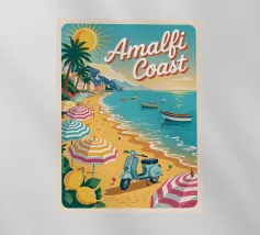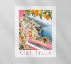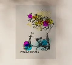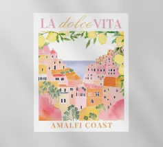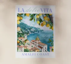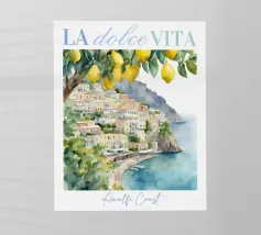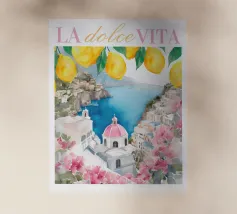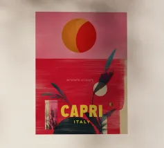 Celebrate la dolce vita con questa vivace stampa d'arte a collage ispirata a Capri, in Italia. Un incantevole dipinto di un villaggio di mare è incorniciato da allegri motivi di agrumi, uno scooter retrò e un cactus con gli occhiali da sole, il tutto stratificato con audaci forme astratte in arancione, magenta e verde acqua. È il pezzo perfetto per tutti coloro che desiderano le vibrazioni mediterranee, l'estetica retrò e l'eccentricità dell'arredamento ispirato ai viaggi.