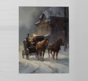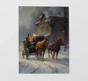 Questo suggestivo dipinto mostra una carrozza trainata da cavalli che percorre una strada innevata, mentre la calda luce delle lanterne illumina la sera. Il cocchiere, in spessi abiti invernali, guida i cavalli con calma nella notte gelida. Una scena piena di nostalgia, romanticismo e tranquillità invernale, che trasporta lo spettatore in un'epoca passata ricca di fascino e contemplazione.
