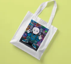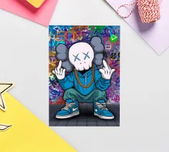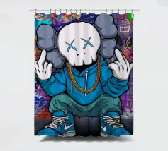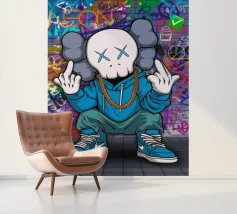 L'immagine raffigura un personaggio dei cartoni animati con una testa simile a un teschio e occhi "XX", che indossa una felpa blu con cappuccio e una catena d'oro. Il personaggio è accovacciato e allunga entrambe le dita medie. Lo sfondo è un muro di mattoni ricoperto di graffiti con vari simboli e disegni al neon. Le scarpe del personaggio sono blu con swooshes Nike bianchi. L'atmosfera generale è tagliente e urbana.