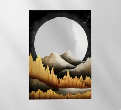 Questa accattivante stampa presenta una luna piena, immersa in un morbido bagliore dorato, su uno sfondo nero profondo. Due eleganti fiori stilizzati, uno con petali scuri e quasi iridescenti e l'altro con delicate foglie dorate, si ergono sotto il globo lunare. Il gioco di luci e ombre, unito agli intricati dettagli degli elementi floreali, crea un pezzo davvero ipnotico che aggiungerà un tocco di bellezza celestiale a qualsiasi spazio.