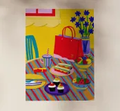 Una vivace illustrazione di una tavola imbandita con un'abbondante e colorata varietà di cibo, tra cui sushi e borse della spesa. La scena è una rappresentazione gioiosa dell'abbondanza e di un pasto soddisfacente dopo lo shopping.
