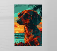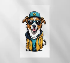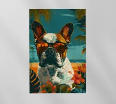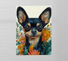 Cane Chihuahua nero e abbronzato, con sciarpa blu stile bandana, occhiali da sole rotondi, illustrazione di un buffo Chihuahua che tiene un bicchiere da cocktail con la zampa, simpatico disegno di Chihuahua per dare colore alle pareti o per decorare l'agenda. Spirito pop e contemporaneo. Per tutti gli amanti del Chihuahua.
