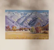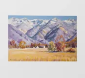 Maestose montagne innevate si ergono su una valle tranquilla e invernale; la luce nitida e la fresca tavolozza di bianchi, blu e gialli pallidi catturano la bellezza silenziosa e serena del paesaggio alpino.