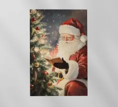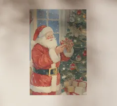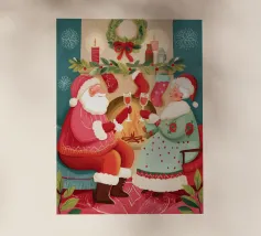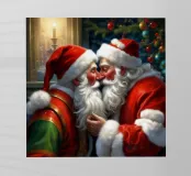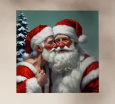 Babbi Natale che si baciano teneramente a lume di candela vicino a un albero di Natale.