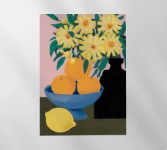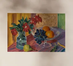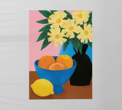 Un disegno a pastello espressionista di un vaso di arance e blu con fiori potrebbe rappresentare il soggetto con tratti decisi e ampi e una tavolozza di colori vibranti ed esagerati su uno sfondo scuro. Il vaso arancione irradia calore, mentre gli accenti blu contrastano dinamicamente, creando un senso di profondità ed energia. I fiori spuntano dal vaso in forme espressive e poco definite, con petali e foglie in intense tonalità di giallo, che si mescolano leggermente per trasmettere movimento e vitalità. Le ombre e le luci sono intensificate, conferendo alla scena una qualità onirica.