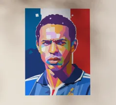 Coco in stile WPAP è un ritratto geometrico audace e colorato del famoso calciatore francese. Utilizzando tinte vivaci e forme spigolose, l'opera d'arte WPAP (Wedha's Pop Art Portrait) cattura la calma determinazione e il look iconico di Coco, riflettendo la sua eleganza, forza e abilità sul campo da calcio.